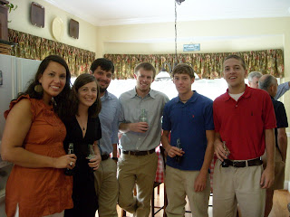 Let's see - Our daughter, Laura is on the left, then Lauren (our future daughter-in-law) is next (and no, you aren't confused - the bride for the shower is also Laura and then there is Laura Mc - one of the hostesses and what makes the whole thing even crazier is that our daughter, Laura was in a wedding on Saturday night - that groom's name was Michael and his bride, Lauren!!! - isn't all of that crazy?) - okay back to the folks in the picture - Glenn and Kaylor and Porter and Kevin. Glenn and Kaylor (son of Laura and Allen) and Michael have been friends for years. They have all roomed together at various times while living in Auburn.