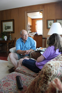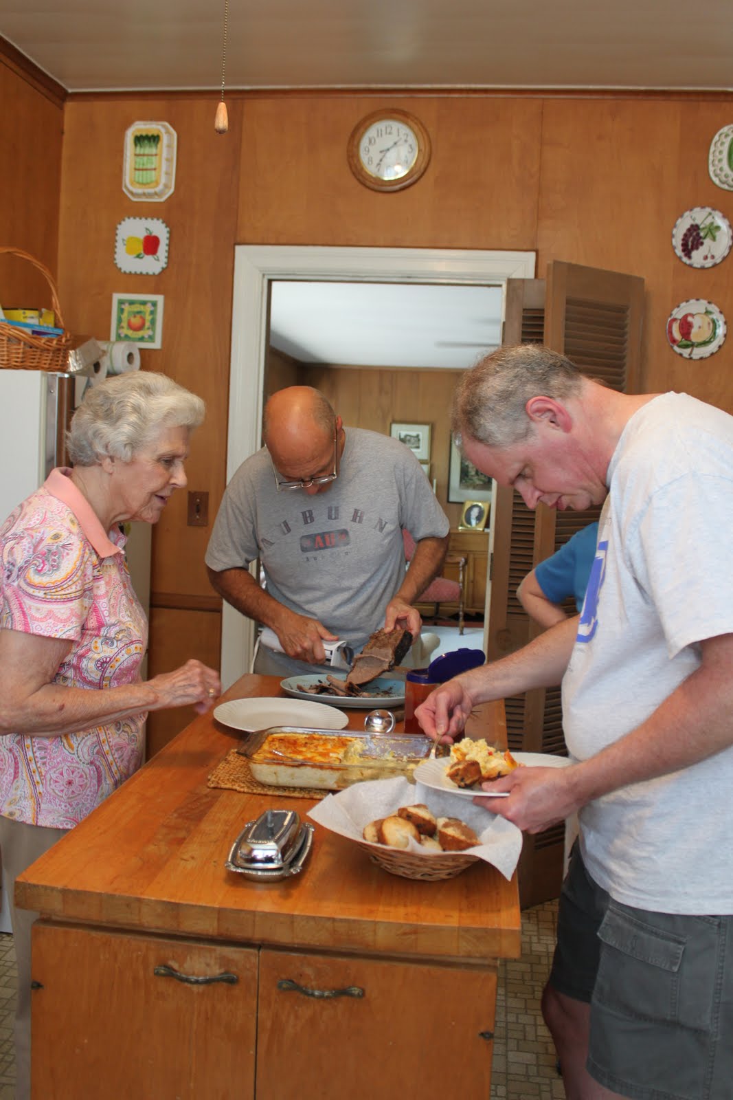 Grandmother is on the left. Mark is carving some more roast beef and Bill (Mark's younger brother) is serving his plate. While the kids were growing up, we had a table full on Sundays - there are four of us and Grandmother and Bill and Rebecca and George, Alice and Grace. When both Glenn and Laura were living in Auburn, we had many quiet Sundays - if George and Alice and Grace go to Clopton (Alice's hometown), then it would be just Grandmother, Mark and I (because Bill and Rebecca don't usually arrive in time to eat with us). We've loved having Laura live back at home so that we have her with us on Sundays. Sunday lunch at Grandmother's house is definitely a tradition!