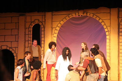 I haven't blogged in so long (actually it really hasn't been that long!!). We didn't have internet service at the beach last week . . .I did manage to connect on "Pat's" wireless a few times (I have no idea who "Pat" is . . .). I'm actually using the most recent pictures first . . so for a few posts, I guess I'll be moving backwards. On Saturday night, we went to the Joe Jefferson Playhouse in Mobile to see Jesus Christ Superstar. Jerel (remember Jerel from previous posts? - he sang at Glenn and Lauren's wedding . . .he fell asleep in our backyard . . .) was Jesus. I took pictures without my flash and "through" the folks in front of us. We had third row seats so at least there weren't too many heads in front of us.