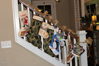 We stopped hanging our stockings on the mantle a few years ago (when they fell and pulled down the garland, etc.!) I think it is fun to hang them on the stair rail. At the bottom right, you can see how I keep our Christmas cards - my daughter-in-love taught me this trick. You use on "o" ring and punch a hole in each card as it arrives. I put one of our cards on top. I now have rings for 7 or 8 years.