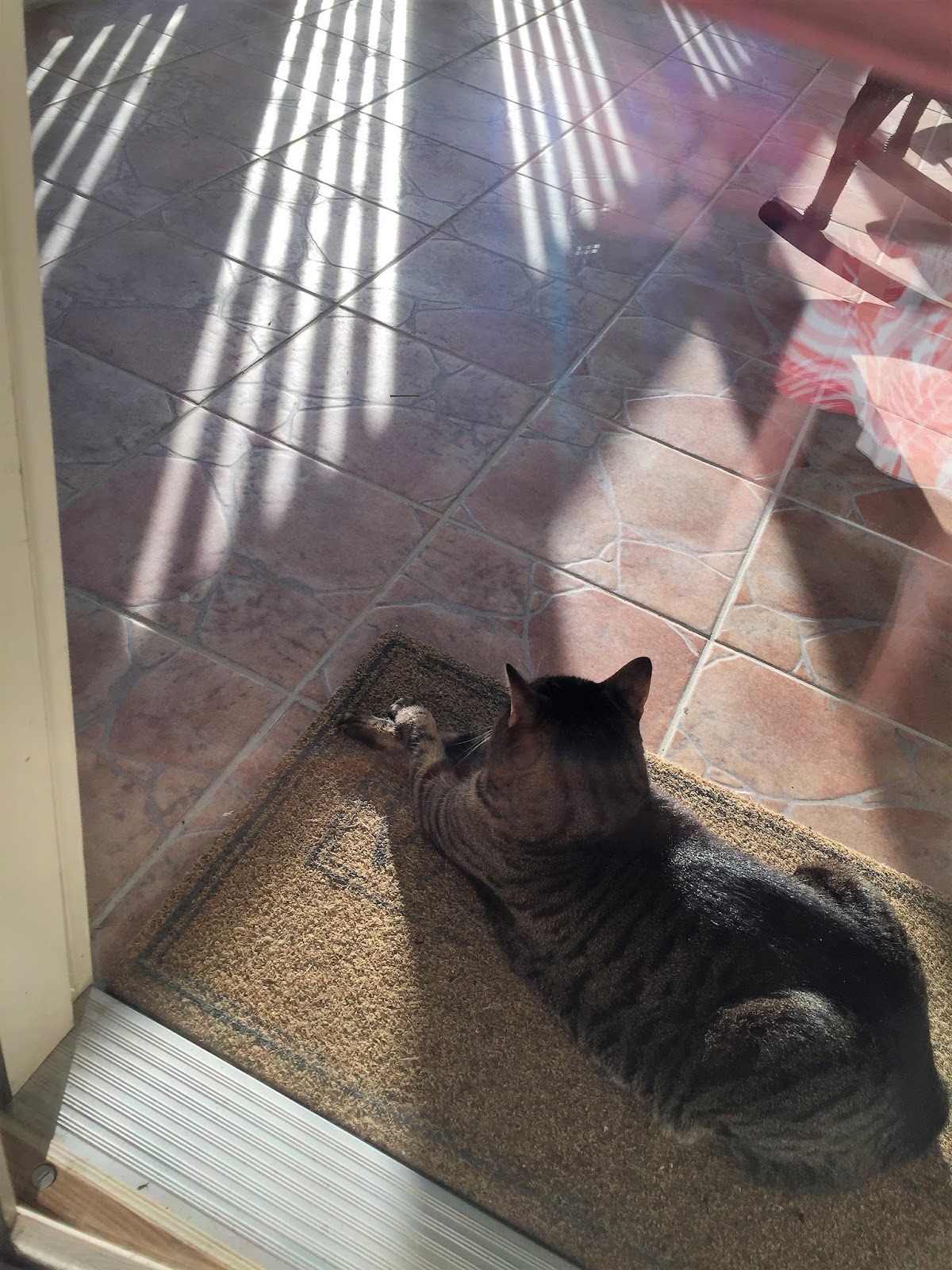 Our weather is always strange in Alabama but this year it has been REALLY strange. A couple of weeks ago it was almost 80 degrees and today the temp never rose out of the 40's. When it was 78, our cat was in heaven. He loves the screen porch. Look at his sweet little paws crossed over each other.
