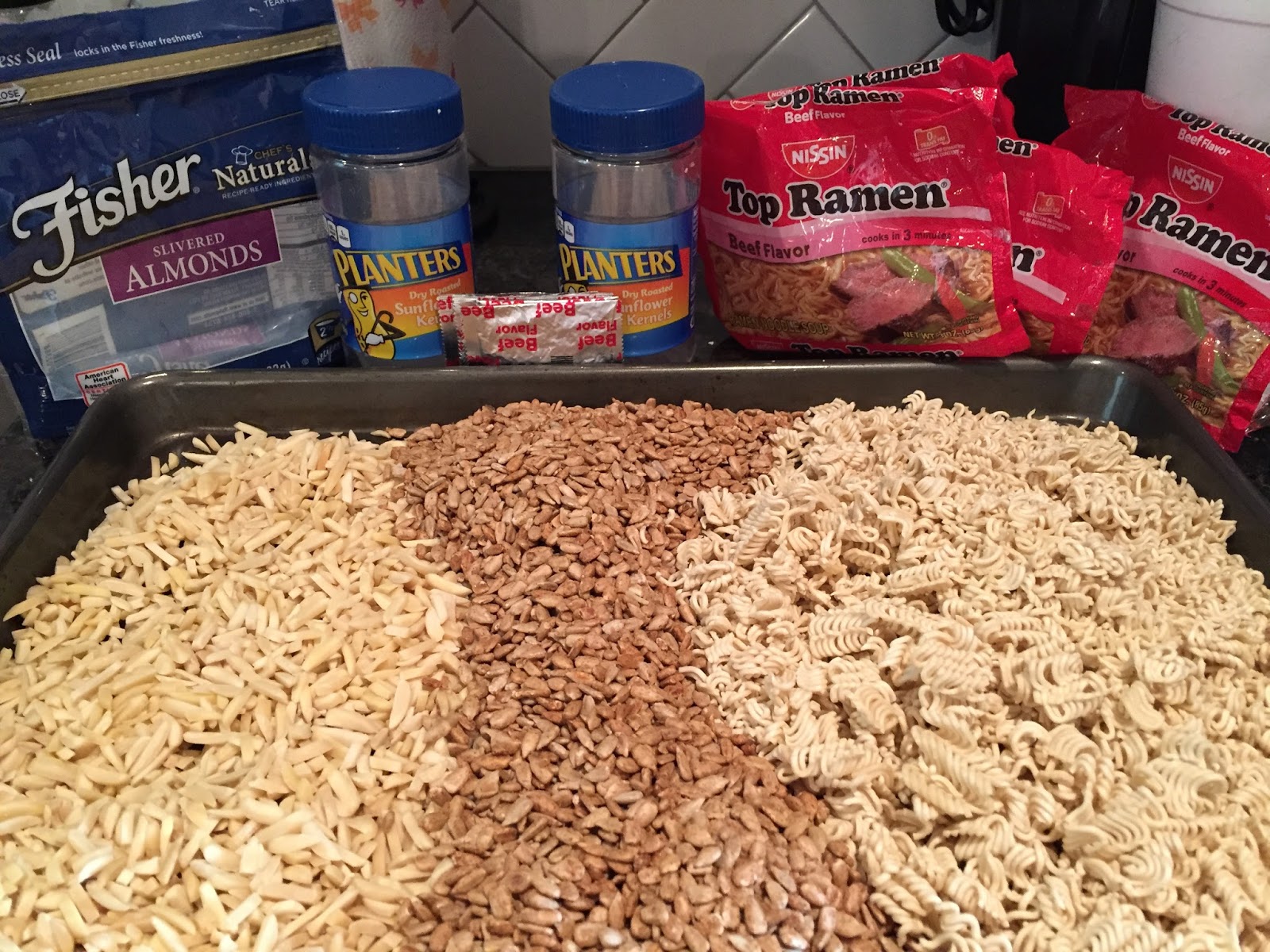 Place nuts, seeds, and noodles on large baking sheet and toast in oven for 12 minutes or until almonds are just beginning to brown. Remove from oven and place cookie sheet on rack to cool.