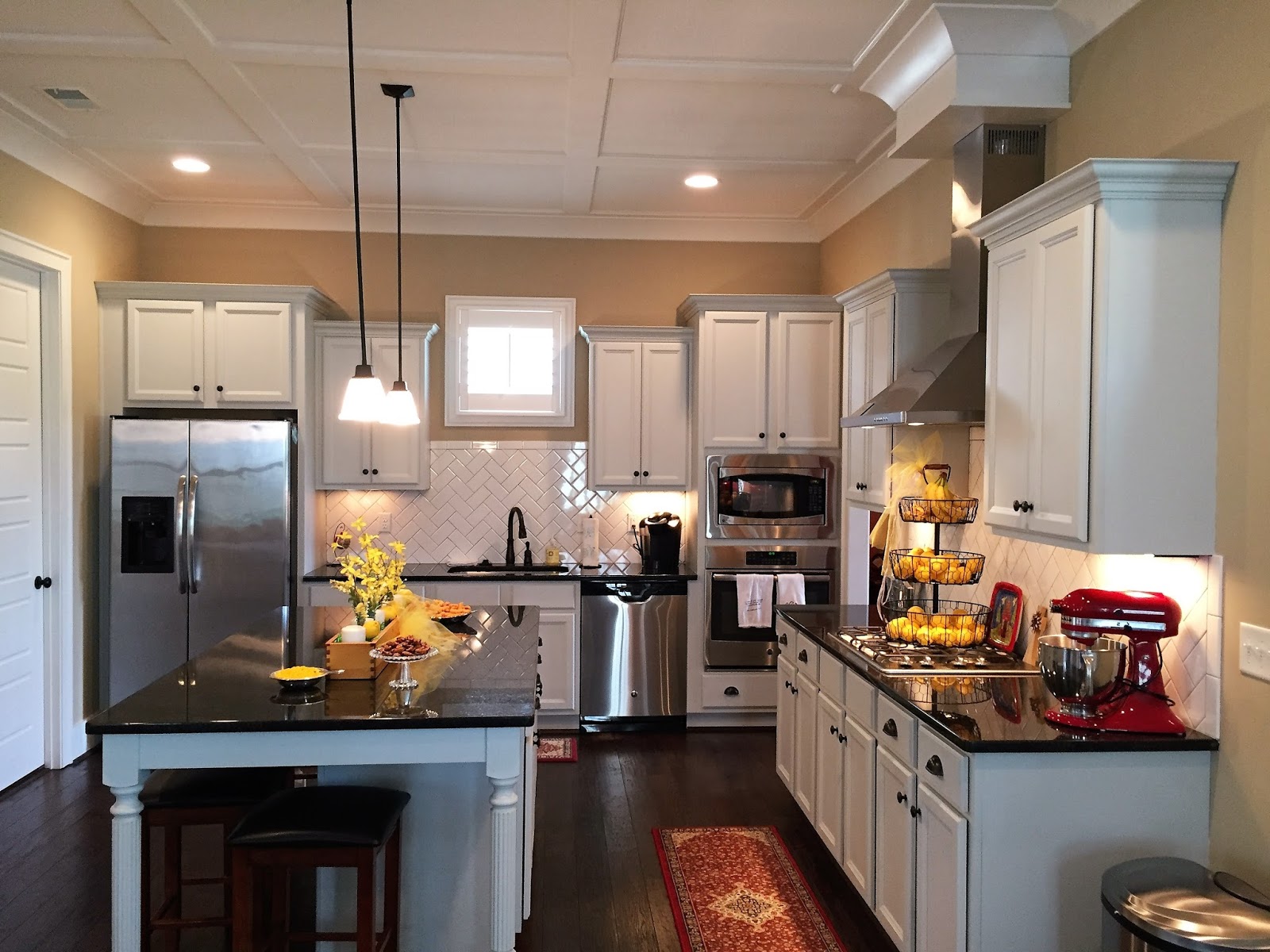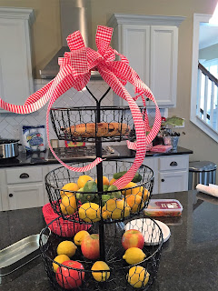 I moved my three tiered basked from the island over to the cooktop and filled it with lemons (and left the bananas because they are yellow, right??). I made a big loopy bow from yellow and gray ribbons.