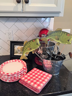 Some people have to use fake antlers but we don't! My whole decoration scheme was red and white and I asked Mark to buy bobbers . . .and he brought home orange and yellow ones! You would be so proud of me . . .I didn't say, "why in the world did you buy that color?" I said, "thank you!" Y'all this was a rare occurrence for me . . .my words seem to fall out of my mouth before I can catch them. Thank you Holy Spirit for the clamp on my lips! Not a single person said, "why do you have orange and yellow bobbers when everything else is red and white?"
